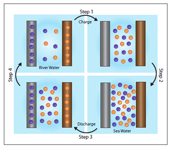 Initially, the battery is filled with freshwater and a small electric current is applied to charge it up. The freshwater is then drained and replaced with seawater. Because seawater is salty, containing 60 to 100 times more ions than freshwater, it increases the electrical potential, or voltage, between the two electrodes. That makes it possible to reap far more electricity than the amount used to charge the battery.
