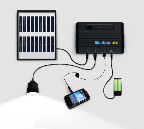 For ambient night time lighting there is a 25 LED, 2 watt lamp which can be plugged into a top USB port of the solar charging device. The Sunbox solar charging devices can additionally be used to charge cell phones. This can be possible with help of one of seven adapter tips, also included. If you need to power a device that doesn’t have a built in battery pack, there is a charging cradle that includes 2 rechargeable AA batteries.