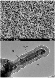 Scientists produce a forest of vertically aligned virus rods using a process developed by Culver’s former Ph.D. student, Elizabeth Royston. A solution of TMV is applied to a metal electrode plate. The genetic modifications program one end of the rod shaped virus to attach to the plate. Next these viral forests are chemically coated with a conductive metal, mainly nickel. Other than its structure, no trace of the virus is present in the finished product, which cannot transmit a virus to either plants or animals. This process is patent-pending.