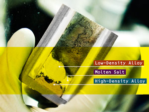 The battery designed by Sadoway and his team works on the same principle as any other: Two electrodes exchange electrons through an electrolyte to complete a circuit. But by using liquid metals for electrodes and molten salt as an electrolyte, their battery can absorb electrical currents that are 10 times higher than present-day high-end batteries. Only the different densities of the liquids keep them separated inside the battery, which means it would be a poor choice for most mobile applications–but smart for a fixed location, such as an electrical installation.