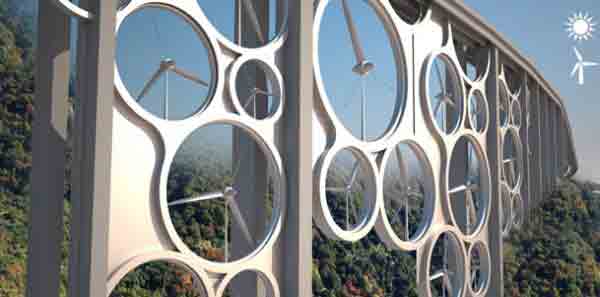 The proposed bridge design consists of huge turbines that fill out the spaces between the pillars of a bridge across the valley and with vast open spaces, high altitude and a terrain that is perfect for constant and consistent wind speed, they should get plenty energy on a regular basis. The “Solar Wind” design also taps into solar energy with the entire road surface being covered with dense grid of solar cells coated with a transparent ad highly resistant form of plastic.