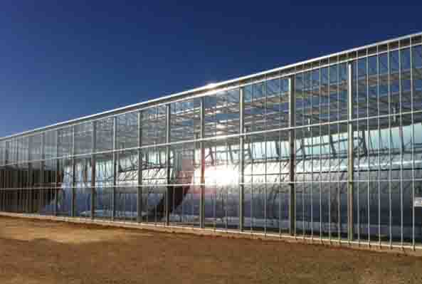 The demonstration solar power steam plant covers an area of 650 square meters among the derricks of the oil field, which is owned by the Berry Petroleum Company. The solar power steam plant consists of a greenhouse with a crenellated roof to maximize the exposure to sunlight. Two rows of seven-meter-wide mirrors are suspended from the top of the greenhouse and concentrate the sunlight onto tubes containing the water. The mirrors generate about a million British thermal units (BTUs) of heat each hour. The amount of steam needed depends on the age of the oil field, but is typically around two million BTUs per barrel of oil.